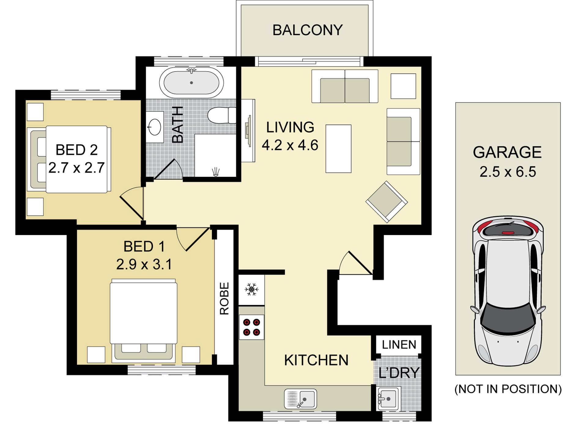 - Two bedrooms, main with built-in wardrobe